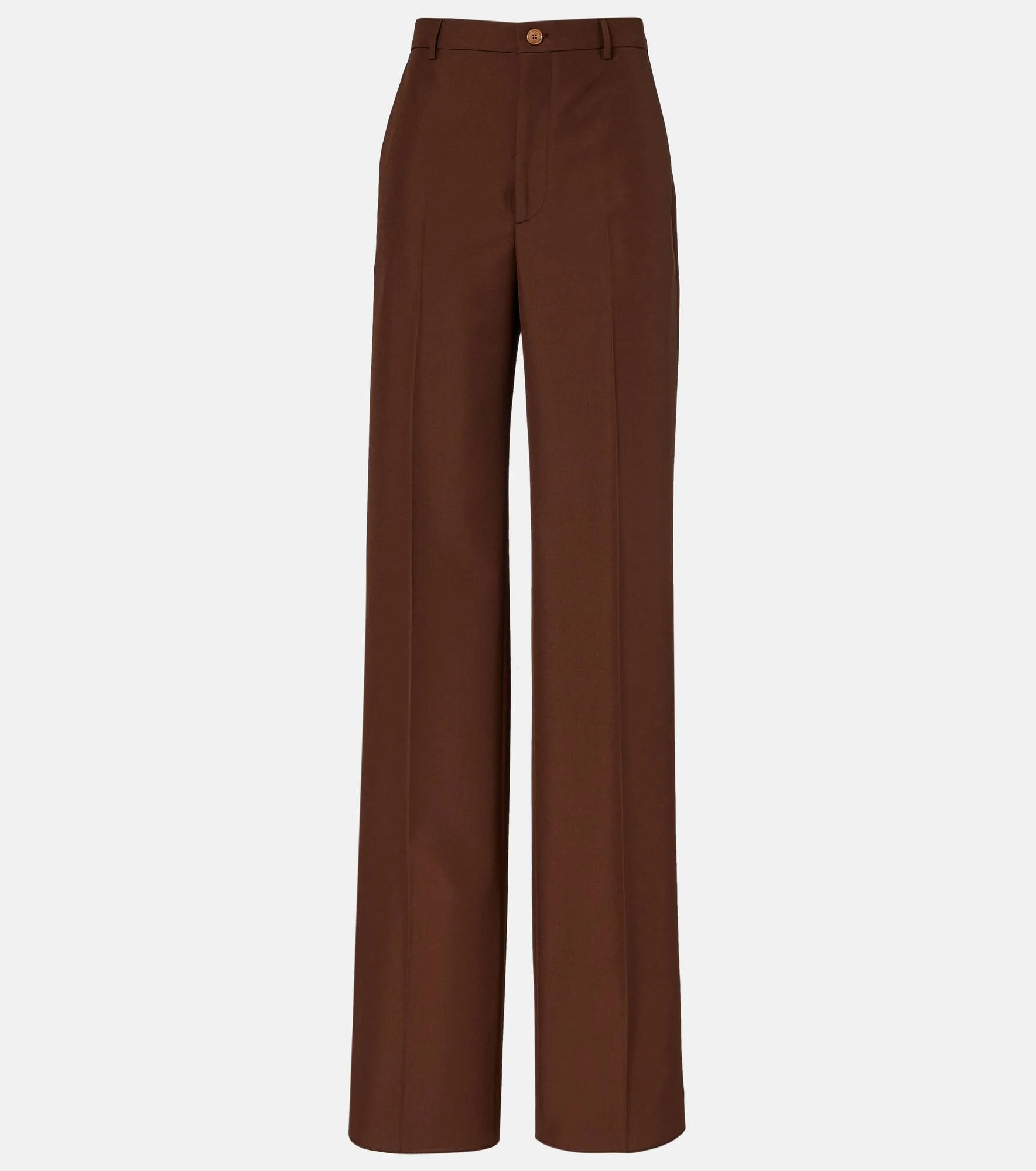 Gucci's collections are both a reflection of the past and a glimpse into the future. Tailored to perfection: these pants are a straight-leg style with a high-rise waistline. Product Details - Material: 100% polyester - Care instructions: dry clean - Made in Italy - Designer color name: Chocolate - Item color: brown - Pocket lining: 100% cotton - Other inner trims: 75% acetate, 25% silk - Closure: zip and button fastening - Belt loops - Pockets: slant pockets, back pockets - Single pleat - Hem: unfinished (ready for alteration) - Item number: P01088149 Size & Fit - Fits large to size - we recommend trying one size smaller - Non-stretchy fabric - Straight leg - High-waisted - Unhemmed for tailoring - The model seen in the picture is 178cm-5'10" and wearing a size IT 38