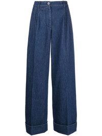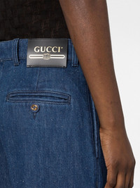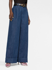 high-waist wide-leg jeans Gucci’s high-waist jeans are a reinterpretation of classic wide-leg styles from the ‘70s. Rendered in an indigo-blue hue, they’re finished with pressed pleats and turn-up hems. Highlights - Indigo blue - Cotton - Denim - High waist - Belt loops - Front button and zip fastening - Pleat detailing - Wide leg - Turn-up hem Made in Italy Composition Lining: Cotton 100% Outer: Calf Leather 100%, Cotton 100% SIZE & FIT Model measurements Height 5 ft 10 in(1.77 m) Bust/Chest 32.28 in(82 cm) Hips 35.03 in(89 cm) Waist 25.19 in(64 cm) Measurement FRONT RISE 11.81 in(30 cm) HIPS 40.15 in(102 cm) WAIST 29.13 in(74 cm) FittingInformation Designed with a wide-leg cut, these trousers allow for a close fit at the waist and offer a loose and roomy fit over the leg Sturdy and hard-wearing, this denim piece offers no stretch This piece fits true to size – take your usual size Washing instructions Dry Clean Only