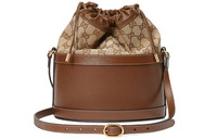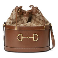 Inspired by archival designs, Gucci Horsebit 1955 bucket bag unifies the original details first introduced over six decades ago with a modern spirit, highlighting the Horsebit. Part of Gucci’s genetic code, the double ring and bar design has been established as one of the most distinctive elements among the House symbols borrowed from the equestrian world. The hardware is paired with a contemporary mix of materials and colors, combining the House's GG canvas with textured brown leather. - Brown textured leather bottom with a vintage effect - Original GG canvas top - Gold-toned hardware - Microfiber lining with a suede-like finish - This product contains leather made through an alternative chrome free tanning process, reducing the environmental footprint compared to traditional methods. - Horsebit detail - Adjustable shoulder strap with 22" drop - Drawstring closure - Weight .5kg approximately - Small size: 8.7" W x 9.8"H x 4.7"D - Made in Italy