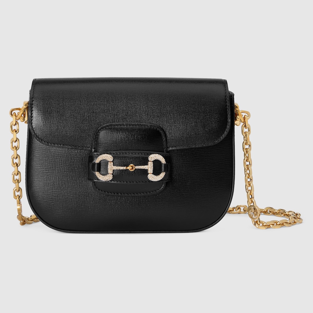 This year, the Gucci Horsebit 1955 spotlights a sparkling iteration of its double ring and bar. The crystal-set hardware creates new visual contrast with the leather material in fresh colors. Here it decorates this black mini bag. - Black leather - Crystal gold-toned hardware - Cotton linen lining - Horsebit - Detachable chain strap with Interlocking G motif and 11" drop - Flap closure - Weight: 1.01lbs approximately - Mini size: 8"W x 5.5."H x 2"D - Made in Italy - Fits up to: iPhone Pro Max/Plus, Airpods, small wallet, and lipstick