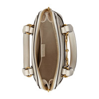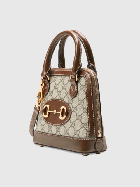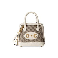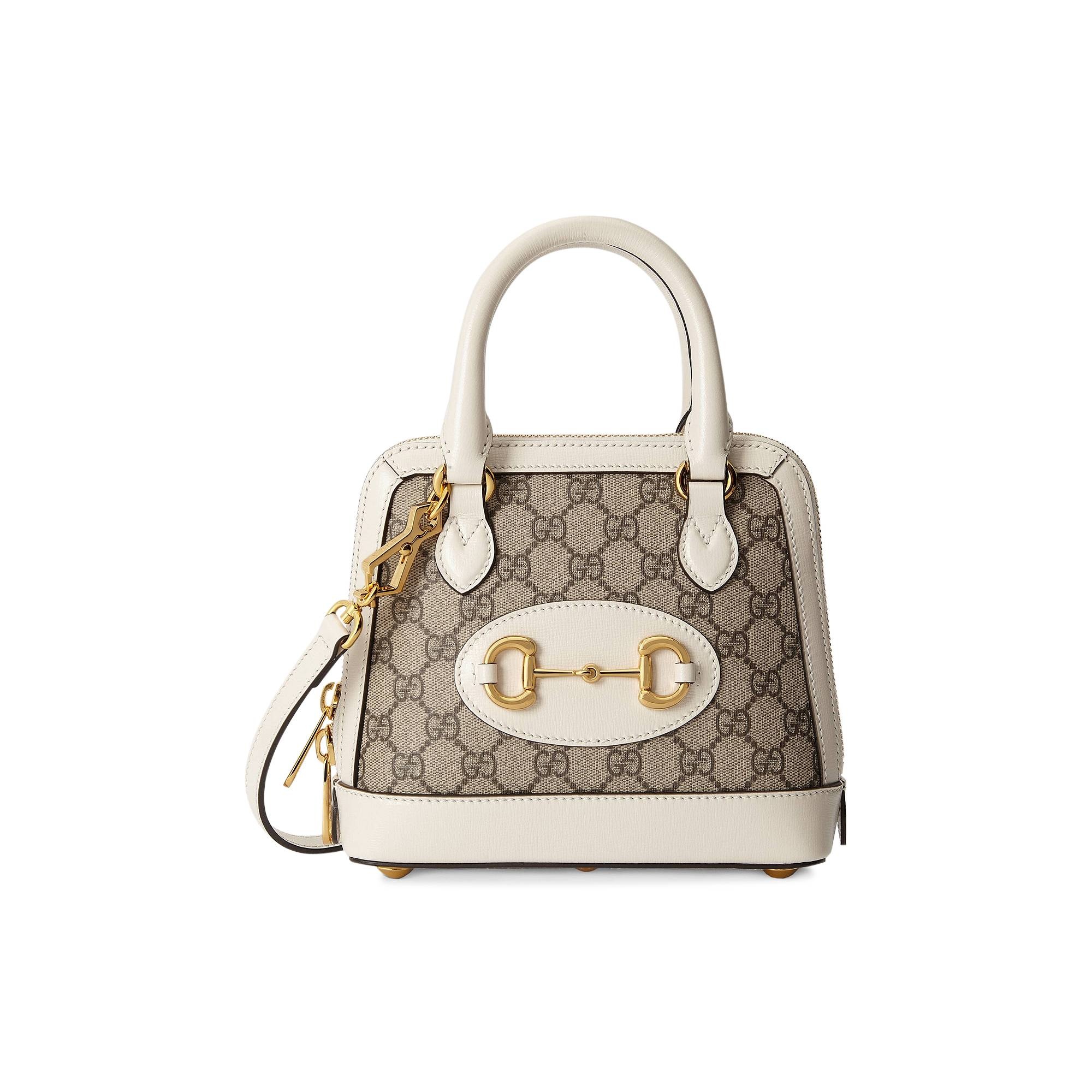 A new introduction to the Gucci Horsebit 1955 line, the mini top handle is crafted from the House's monogram canvas with contrasting white leather details. The collection unifies details first introduced on the original bag that inspired the line from over six decades ago with a modern spirit, highlighting the Horsebit. Part of Gucci’s genetic code, the double ring and bar design has been established as one of the most distinctive elements among the House symbols borrowed from the equestrian world. - Beige and ebony GG Supreme canvas - White leather details - Gold-toned hardware - Cotton linen lining - Inserts contain leather made through an alternative metal or chrome free tanning process, reducing the environmental footprint compared to traditional methods. - Interior: open pocket - This item can fit a cell phone up to 3.1”W x 6.6”H x .4”D - Detachable shoulder strap with 19.7" drop - Extended double zipper closure - Weight: .59kg approximately - Mini size: 7.9"W x 7.7"H x 3"D - Made in Italy - The model is 5'8" tall