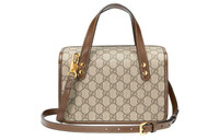 Crafted from the House's monogram canvas with a matching brown leather trim, the bag's rectangular shape adds vintage appeal to the mini bag. Styles presented throughout the collection embrace imaginative stories, often expressing influences of the past - Beige and ebony GG Supreme canvas - Brown leather trim - Gold-toned hardware - Horsebit detail - Interior: open pocket - Double handles with 3.9" drop - Adjustable and detachable shoulder strap with 20" drop - Mini size: 9"W x 6.3"H x 4.7"D - Made in Italy - The model is 5'8" tall.