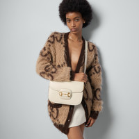 Introduced for Cruise 2020, the Gucci Horsebit 1955 bag is recreated from an archival design. With the same lines and forms first introduced over six decades ago, the accessory unifies the original details with a modern spirit, highlighting the Horsebit. Part of Gucci’s genetic code, the double ring and bar design has been established as one of the most distinctive elements among the House symbols borrowed from the equestrian world. Presented on a small flap shoulder bag, the hardware is paired with textured white leather and completed with a special mechanism that adjusts the length of the shoulder strap so it can be carried on one shoulder or cross body. - White textured leather with a vintage effect - Gold-toned hardware - Microfiber lining with a suede-like finish - Horsebit detail at the front - Half Horsebit detail at each side - Each bag will ship with a small pouch containing two additional button covers that can be used to cover the exposed studs when the shoulder strap is lengthened - Three gussets with one zipper and one open pocket - Adjustable shoulder strap drop: 9.8" - 11.8" - Strap length: 25.6" - 29.1" - Flap closure - Weight: 1.8 lbs approximately - Small size: 9.8"W x 7"H x 3.1"D - Made in Italy - The model is 5'9" tall - Fits up to: iPhone Pro Max/Plus, Airpods, long wallet, and lipstick