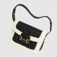 Looks from the Cruise 2024 Aprés Ski selection combine functionality with a stylish touch. Padded leather, fleece, and other fabrics are updated with new logo details. Here, the House's signature handbags present sumptuous materials which blend traditional craftsmanship and contemporary design, combining shearling and smooth leather. - Black smooth leather bonded with shearling - Off white trim - Gold-toned hardware - Horsebit detail at the front - Half Horsebit detail at each side - Each bag will ship with a small pouch containing two additional button covers that can be used to cover the exposed studs when the shoulder strap is lengthened - Three gussets with one zipper and one open pocket - Adjustable shoulder strap drop: 9.8" - 11.8" - Strap length: 25.6" - 29.1" - Flap closure - Weight: 1.8 lbs approximately - Small size: 9.8"W x 7"H x 3.1"D - Made in Italy - Fits up to: iPhone Pro Max/Plus, Airpods, long wallet, and lipstick
