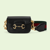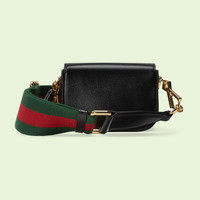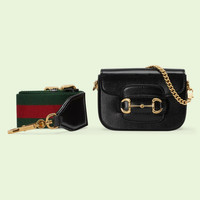 Inspired by archival designs, the world of Gucci Horsebit 1955 unifies the original details first introduced over six decades ago with a modern spirit, highlighting the Horsebit. Part of Gucci’s genetic code, the double ring and bar design has been established as one of the most distinctive elements among the House symbols borrowed from the equestrian world. The hardware defines this black leather wallet. The style takes on a versatile feel with the addition of a Web strap in green and red. - Black leather - Gold-toned hardware - Moiré lining with microfiber finish - Horsebit - Inside: 1 card slot - Handle with 3.1" drop - Web shoulder strap with 13.4" drop - 4.7"W x 3.5"H x 1.6"D - Made in Italy - Weight: 0.32kg approximately