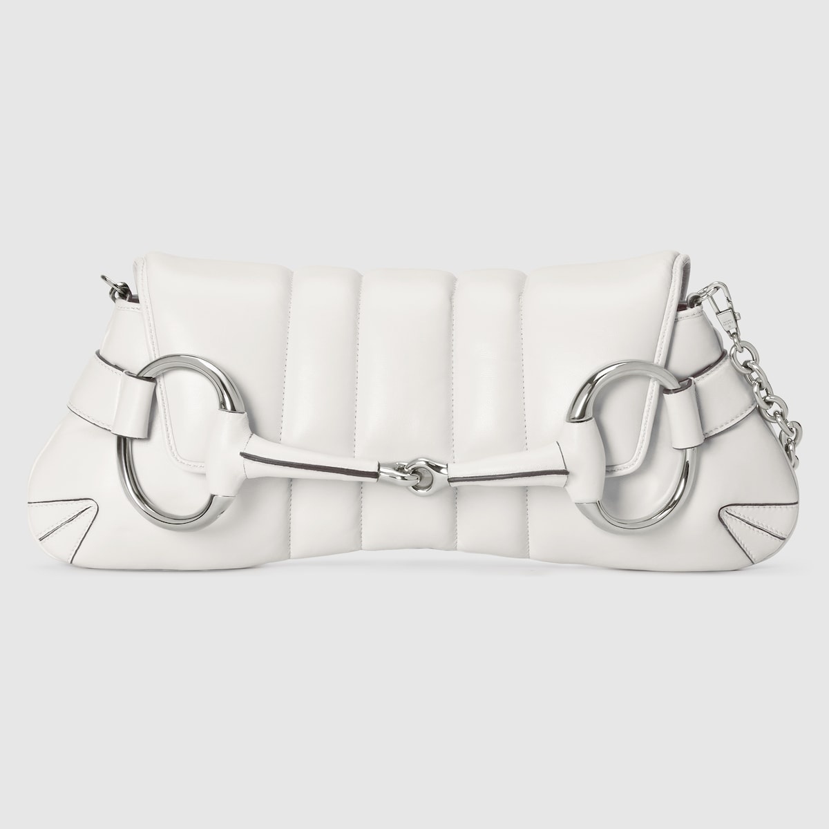 Gucci successfully recalls its past by connecting the archives to the present day. Adorned with a maxi Horsebit, first made popular during the early ‘2000s, this silhouette continues to be one of the most recognizable handbags of the House. Revisited for the Fall Winter 2023 collection, it is presented in various colors and textures that follow a contemporary approach. - White quilted leather - Palladium-toned hardware - Part of the - selection, this product is embedded with NFC technology—an innovative way to authenticate and experience your item digitally. - Maxi Horsebit - Inside: 1 card slot and pocket - Detachable leather strap with 8.3" drop - Detachable chain shoulder strap with 8.1" drop - Magnetic snap closure - Weight: 1.5 lb approximately - Medium: 15"W x 6"H x 6.3"D - Made in Italy - Fits up to: iPhone Pro Max/Plus, Airpods, long wallet, and lipstick