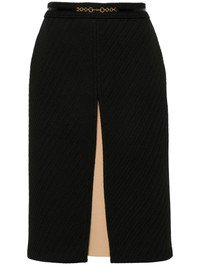 horsebit-chain striped skirt Highlights - Black - Wool - Leather trim - Diagonal stripe pattern - Signature horsebit detail - Gold-tone hardware - High waist - Concealed rear zip fastening - Front slit - Straight hem Made in Italy Composition Outer: Leather 100%, Wool 100%, Polyester 88%, Polyamide 12% Lining: Viscose 100% SIZE & FIT Model measurements Height 5 ft 11 in(1.8 m) Bust/Chest 32.67 in(83 cm) Hips 36.22 in(92 cm) Waist 24.4 in(62 cm) FittingInformation This midi-length skirt is intended to be worn high on the waist Made from a midweight non-stretch fabric This piece fits true to size – take your usual size Washing instructions Dry Clean Only