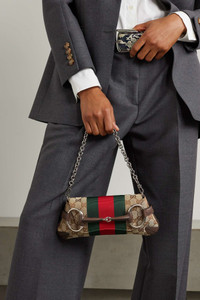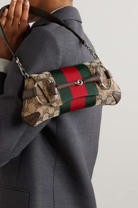 EDITORS'NOTES The accessories at Gucci's Fall '23 show drew influence from iconic archival hits, even those predating the legendary Tom Ford era. Embellished with inflated 'Horsebit' hardware, this leather-trimmed tote is made from canvas-jacquard and has exaggerated webbing. Echo the runway by slipping your hand through the front and carrying it tucked closely to you. SIZE & FIT This item’s measurements are: - Min. Strap Length: 44cm / 17.3in - Handle Drop: 23cm / 9.1in - Depth: 4cm / 1.6in - Max. Strap Length: 55cm / 21.7in - Height: 12cm / 4.7in - Width: 28cm / 11in DETAILS & CARE - Beige and dark-brown canvas-jacquard, tan leather (Calf), green and red webbing - Clasp fastening at front - Comes with dust bag - Weighs approximately 1.8lbs/ 0.8kg