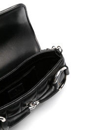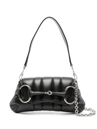small Horsebit Chain shoulder bag Gucci’s shoulder bag is a fresh take on the archival Horsebit 1955 model: note the quilted leather construction and elongated silhouette. It’s suspended by a silver-tone chain-link strap and adorned with coordinating equestrian-inspired hardware. Highlights - Black - Calf leather - Grained texture - Padded design - Quilted - Signature horsebit detail - Foldover top with magnetic fastening - Single detachable top handle - Detachable chain-link shoulder strap - Main compartment - Internal logo patch - Internal slip pocket - Suede lining - This piece comes complete with a protective dust bag. Made in Italy Composition Outer: Calf Leather 100% SIZE & FIT Model measurements Height 5 ft 9 in(1.76 m) Bust/Chest 31.88 in(81 cm) Hips 35.43 in(90 cm) Waist 24.8 in(63 cm) Measurement DEPTH 1.18 in(3 cm) HEIGHT 4.52 in(11.5 cm) WIDTH 10.23 in(26 cm) HANDLE 8.26 in(21 cm)