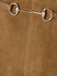 Gucci's skirt is threaded with smooth leather and the label's signature horsebit hardware that's designed to look like a matching belt. It's made from supple suede and has a generous front pleat that accentuates the A-line shape. Large to size. See Size & Fit notes. Size & Fit - Fits large to size, take one size smaller than normal - Falls below the knee, designed to be worn at the waist - Supple, non-stretchy suede - Model is 177cm/ 5'10", normally wears an IT 40 and is wearing an IT 38 Model measurements: - Bust: 79cm/ 31” - Waist: 61cm/ 24” - Hip: 89cm/ 35” Details & Care - Brown suede (Lamb) and leather (Calf) - Concealed hook and zip fastening at side - 100% suede (Lamb); trim: 100% leather (Calf)