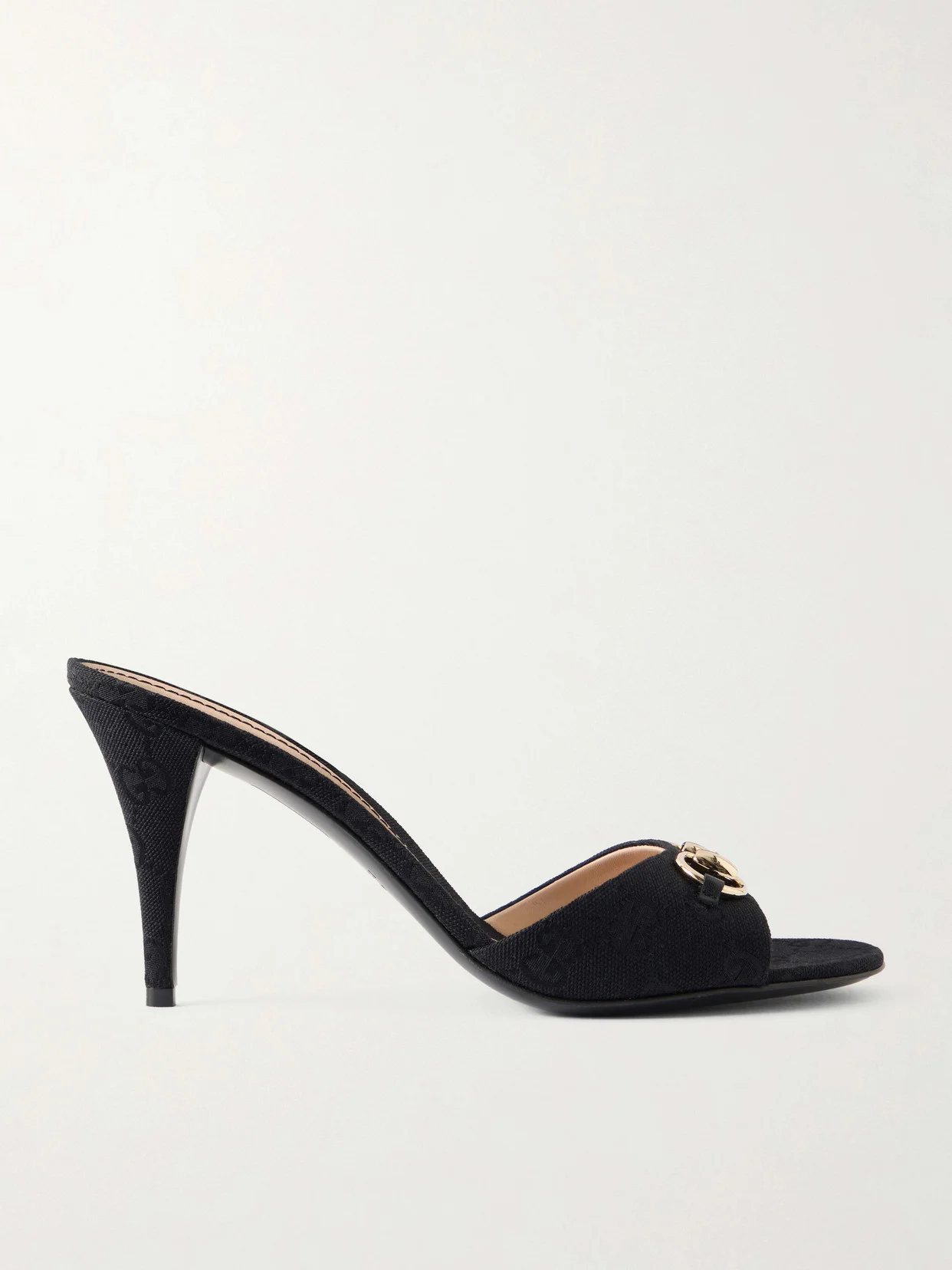 Gucci's mules are a sleek, go-to staple for warm-weather looks. Crafted from canvas jacquard patterned with the ‘GG' logo, they feature round open toes, an 85mm stiletto heel, and gold-tone horsebit hardware. Wear them to add a glamorous touch to even your simplest outfits.