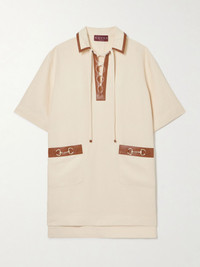 Gucci's dress is made from linen and has smooth tan leather trims framing the pointed collar, lace-up placket and front patch pockets. The longer back hem provides added coverage, while the gold-tone horsebit plaques make it instantly recognizable as the brand's. Size & Fit - Fits true to size, take your normal size - Designed for a loose fit - Lightweight, non-stretchy fabric - Model is 180cm/ 5'11" and is wearing an IT 40 Model measurements: - Bust: 80cm/ 31.5" - Waist: 65cm/ 25.5" - Hip: 89cm/ 35" Details & Care - Cream linen, tan leather - Slips on - 100% linen; trim1: 100% leather (Cow); trim2: 100% leather (Lamb); lining: 75% acetate, 25% silk - Designer color: Gardenia/ Mix