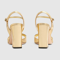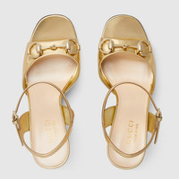 This pair of mid-heel sandals is crafted in soft and refined leather, the signature Horsebit defines the design adding a touch of timeless elegance. The adjustable ankle closure completes the style. - Golden metallic leather - Women's - Silver-toned hardware - Horsebit - Open toe - Adjustable ankle closure - High heel - Height: 3.7" - Made in Italy