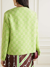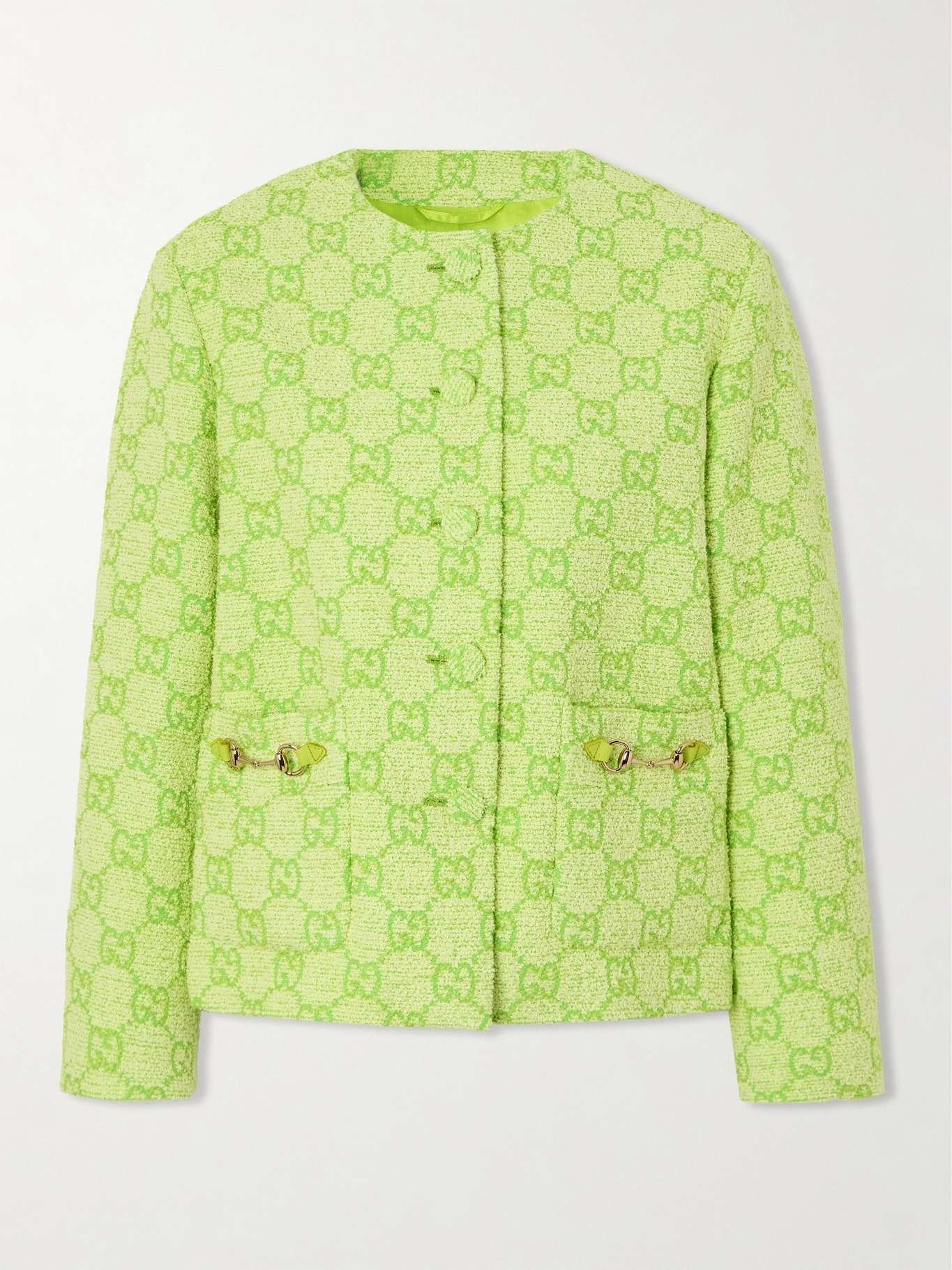 EDITORS'NOTES For Fall '24, Gucci injects vibrant pops of color into its signature 'GG' motif. Inspired by '60s tailoring, this jacket is cut for a boxy fit from tonal-green cotton-blend boucle-jacquard. It's traced with covered buttons and finished with signature horsebit hardware on the pockets. SIZE & FIT Model measurements: - Fits true to size, take your normal size - Designed for a slightly loose fit - Mid-weight, non-stretchy fabric - Model is 175cm/ 5'9" and is wearing an IT 40 - Bust: 78cm/ 31" - Waist: 62cm/ 24.5" - Hip: 83cm/ 32.5" DETAILS & CARE - Green cotton-blend boucle-jacquard, green leather - Button fastenings through front - 60% cotton, 22% polyester, 16% polyamide, 2% viscose; trim: 100% leather (Calf); lining: 100% viscose - Dry clean