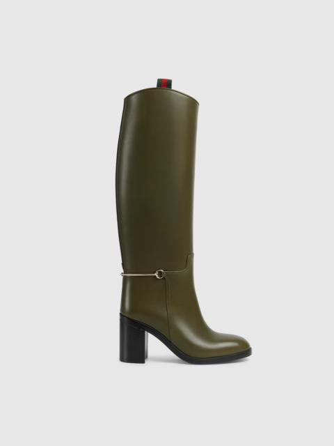 Featuring a slim Horsebit detail and paying homage to the House's rich equestrian heritage, these boots are crafted in supple and smooth leather. The classic silhouette is sophisticated and perfectly narrates the Gucci elegance. - Gucci Rosso Ancora red leather - Silver-toned hardware - Slim Horsebit - Web puller tag - Leather sole - Mid-heel - Height: 3.3" - Made in Italy