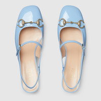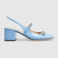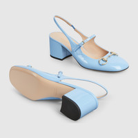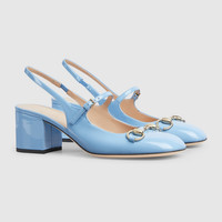 The iconic Horsebit defines this pair of patent leather pumps. The rounded toe and the adjustable ankle closure complete the style, enhancing its preppy spirit. - Light blue patent leather - Women's - Light gold-toned hardware - Horsebit - Leather sole - Made in Italy
