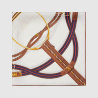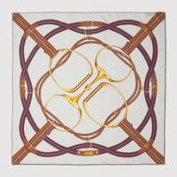 The House's heritage motifs shine through eye-catching new prints. Here, this GG silk jacquard scarf features a Gucci Horsebit print, demonstrating Gucci's design inspirations from the equestrian world that recall bygone eras. - White GG silk jacquard - Gucci Horsebit print - 35.4"W x 35.4"L - Made in Italy - The dimensions of this item may vary slightly as the hem is hand-sewn