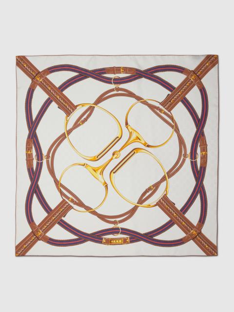 The House's heritage motifs shine through eye-catching new prints. Here, this GG silk jacquard scarf features a Gucci Horsebit print, demonstrating Gucci's design inspirations from the equestrian world that recall bygone eras. - Light pink and pink GG silk jacquard - Gucci Horsebit print - 35.4"W x 35.4"L - Made in Italy - The dimensions of this item may vary slightly as the hem is hand-sewn