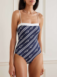 EDITORS'NOTES Gucci's swimsuit is printed with alternating diagonal stripes and the house's iconic horsebit motif. It's made from smoothing stretch fabric and has high-cut legs. Double it as a bodysuit with cutoff shorts. SIZE & FIT Model measurements: - Fits true to size, take your normal size - Medium brief coverage - Model is 177cm/ 5'10", bra size 32C and is wearing a size Small - Bust: 82cm/ 32" - Waist: 64.5cm/ 25" - Hip: 89.5cm/ 35" DETAILS & CARE - Navy and white stretch-jersey - Pulls on - 74% polyamide, 26% elastane - Hand wash - Lotion, sunscreen, oil and chlorine can cause discoloration of this item; this is not a manufacturing defect. Please follow care instructions to keep your swimwear in the best condition