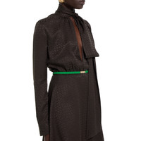 In the Cruise 2026 collection, women's ready-to-wear pieces celebrate the Gucci wardrobe, blending archival influence with the history of Florence in a playful melange, ranging from the minimal to the maximal. Crafted from Horsebit silk jacquard, this dress is completed with a self-tie neck bow. - Dark brown Horsebit silk jacquard - Interlocking G button - Unlined - Self-tie neck bow - Long sleeves - Engraved Gucci buckle belt - Length: 33.4" based on a size 40 (IT) - Made in Italy - Fabric: 100% Silk - Belt: 100% Silk - Lining: 75% Acetate, 25% Silk