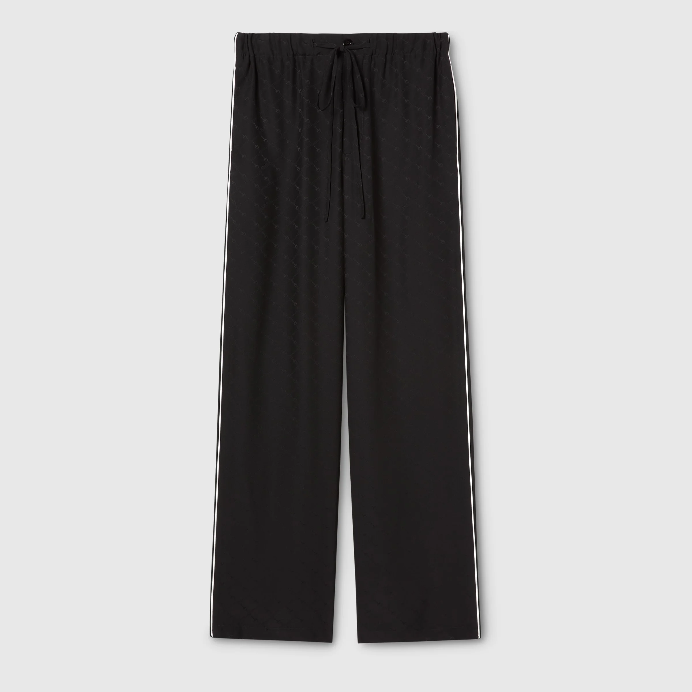 The Cruise 2026 women's ready-to-wear collection celebrates the Gucci wardrobe, blending archival influence with the history of Florence in a playful melange, ranging from the minimal to the maximal. This pair of pants is crafted from black Horsebit silk jacquard. - Black Horsebit silk jacquard - Unlined - Elastic waistband - Two back pockets - Front button closure - Length: 44.9"; Hem width: 23.2"