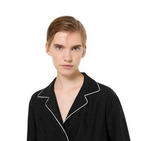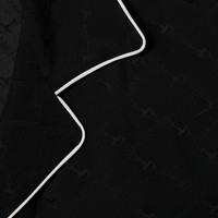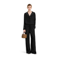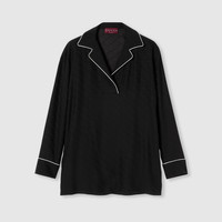 The Cruise 2026 women's ready-to-wear collection celebrates the Gucci wardrobe, blending archival influence with the history of Florence in a playful melange, ranging from the minimal to the maximal. This long-sleeved T-shirt is crafted from black Horsebit silk jacquard and completed with a white piping. - Black Horsebit silk jacquard - White piping - Unlined - Long sleeves - Length: 29.1"