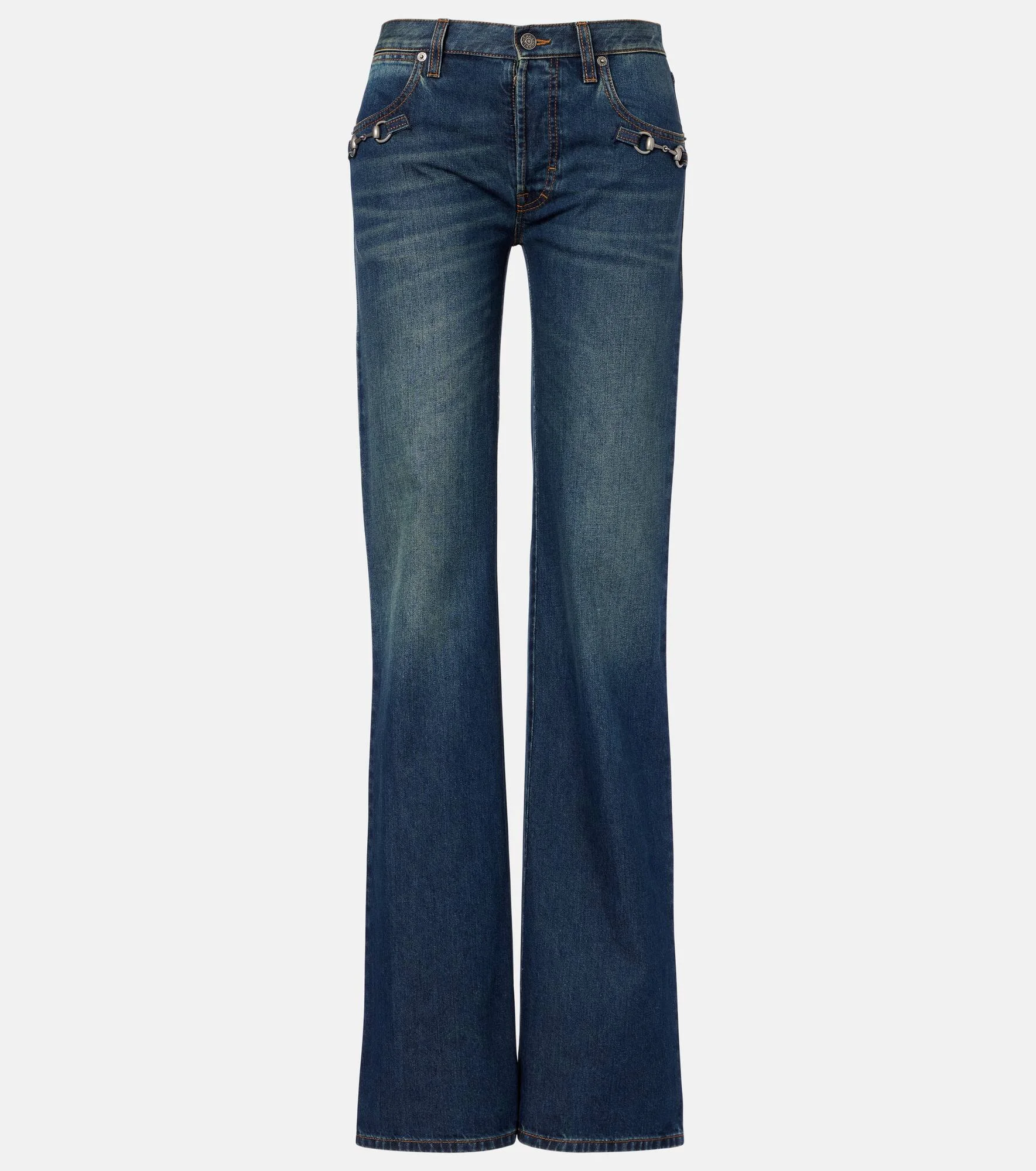 An unwavering commitment to craftsmanship and heritage sets Gucci apart. These jeans feature a straight-leg silhouette and showcase signature Horsebit details at the pockets. Product Details - Material: 100% cotton - Care instructions: dry clean - Made in Italy - Color: blue - Designer color name: Blue - Contains non-textile parts of animal origin - Details: 100% calf leather - Pocket lining: 65% polyester, 35% cotton - Belt loops - Pockets: five pockets - Closure: concealed button placket - Hardware color: silver - Item number: P01150089 Size & Fit - Fits small to size - we recommend trying one size larger - Non-stretchy fabric - Straight leg - Low-rise - The model seen in the picture is 178cm-5'10" and wearing a size 27