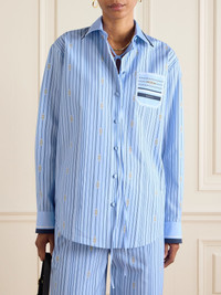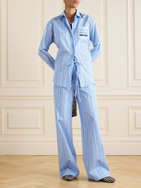 Gucci's horsebit motif, a nod to the house’s equestrian heritage, is subtly integrated into the striped print of this shirt. Made from crisp cotton-poplin, it has a relaxed design with a patch pocket and slim ties at the collar. Wear yours with the coordinating pants in our edit. Size & Fit - Fits true to size, take your normal size - Designed for a relaxed fit - Mid-weight, non-stretchy fabric - Model is 180cm/ 5'11" and is wearing an IT 40 Model measurements: - Bust: 85cm/ 33.5" - Waist: 62cm/ 24.5" - Hip: 88cm/ 34.5" Details & Care - Tonal-blue, white and yellow cotton-poplin - Button fastenings through front - 100% cotton - Dry clean