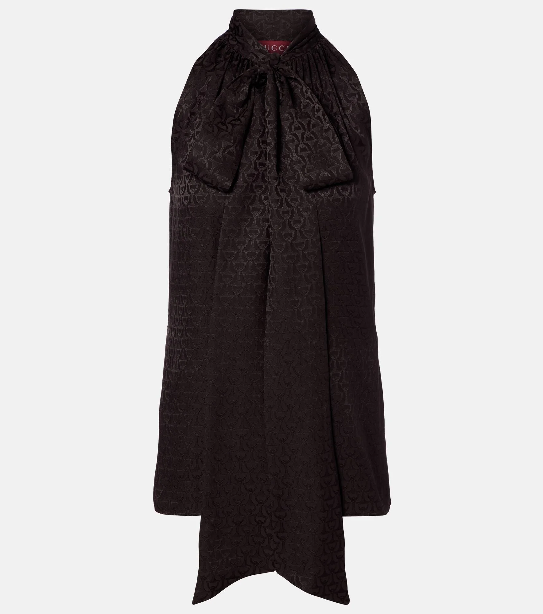 This top from Gucci is primed for sophisticated everyday ensembles. Made from soft silk, the style features a tie at the neckline and is complete with an all-over jacquard Horsebit motif. Product Details - Material: 100% silk - Care instructions: dry clean - Made in Italy - Color: brown - Designer color name: Deep Chocolate - Self-tie neck - Includes: dust bag - Item number: P01119319 Size & Fit - True to size - Straight fit - Loose fit, comes with belt - Non-stretchy fabric - Falls below the hip - The model seen in the picture is 178cm-5'10" and wearing a size IT 40