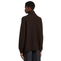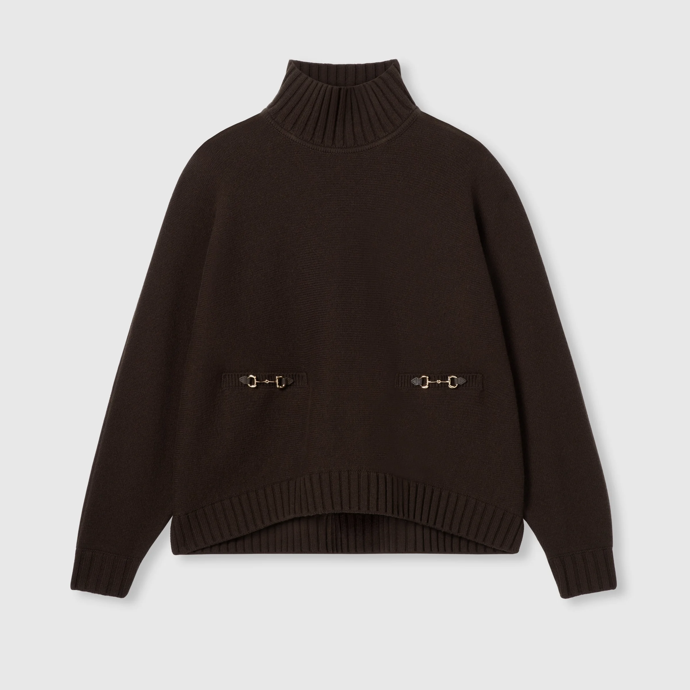 This turtleneck sweater with a dropped appears as part of the Pre-Fall 2025 collection in a wool cashmere blend. The classic design is enriched with two Horsebit hardware details across the front. - Dark brown wool cashmere - Wide turtleneck - Dropped shoulder - Two front pockets - Horsebit detail - Wide rib trim - Made in Italy