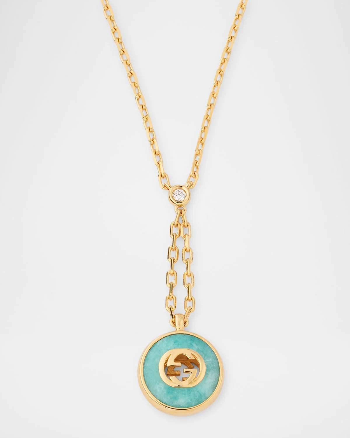 An amazonite inlay surrounds the iconic doubleG logo for this Gucci Interlocking necklace. The Ydrop is finished with a single round white diamond bezel. Necklace length: approx. 16.5 inches Polished 18karat yellow gold 0.028 total diamond carat weight Adjustable length Lobster clasp Made in Italy