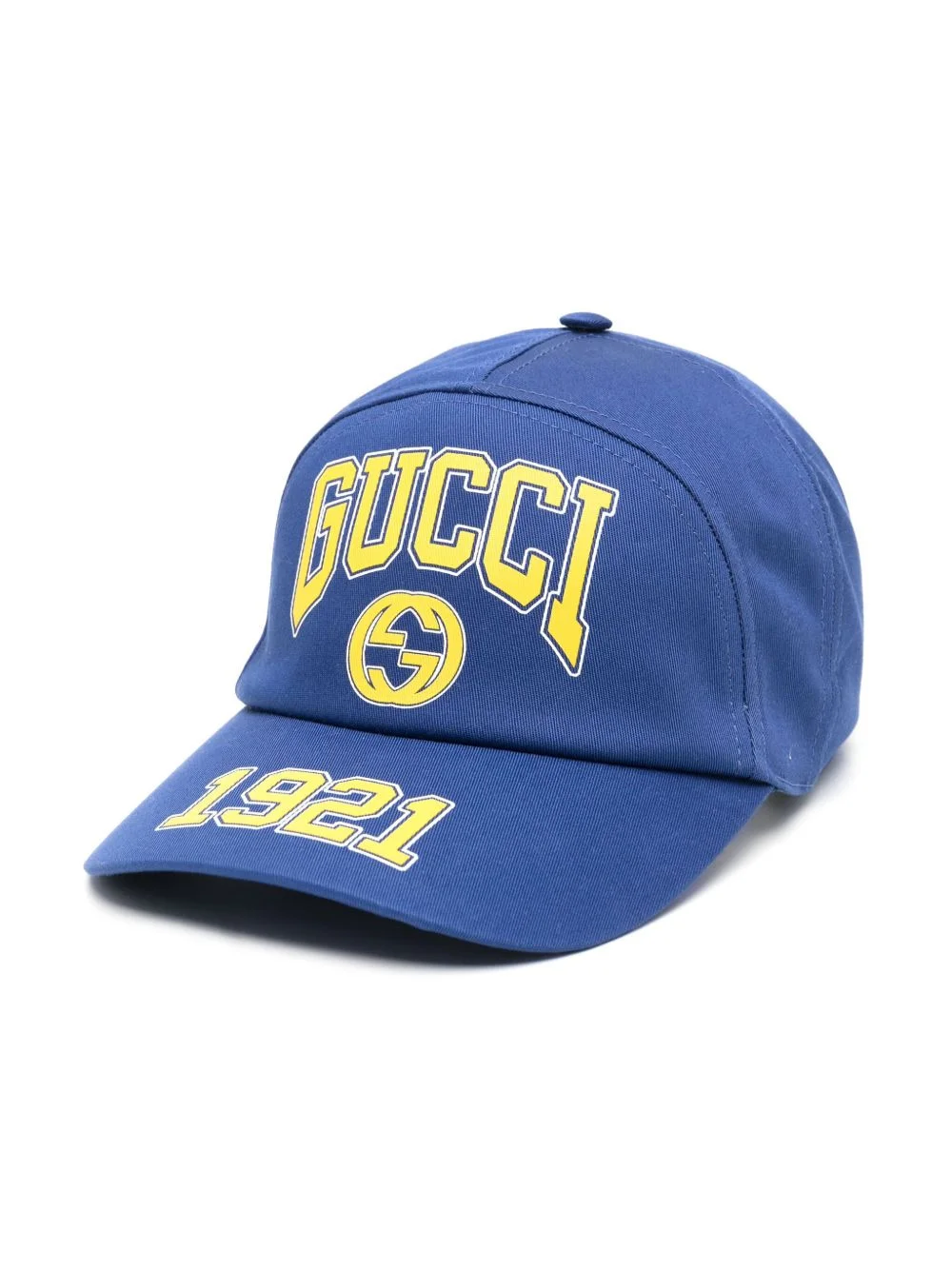Interlocking G 1921 baseball cap This baseball cap is imbued with Gucci house codes. Note the signature Interlocking G motif, further enriched with a 1921 print – a nod to the brand's founding year. Highlights - Navy blue/yellow - Cotton - Rear touch-strap fastening - Fabric-covered button at the crown - Curved peak - Logo print to the front - Signature interlocking g logo Made in Italy Composition Lining: Cotton 55%, Viscose 45% Outer: Cotton 100% SIZE & FIT Measurement BRIM 2.75 in(7 cm) CIRCUMFERENCE 22.44 in(57 cm) Washing instructions Dry Clean Only