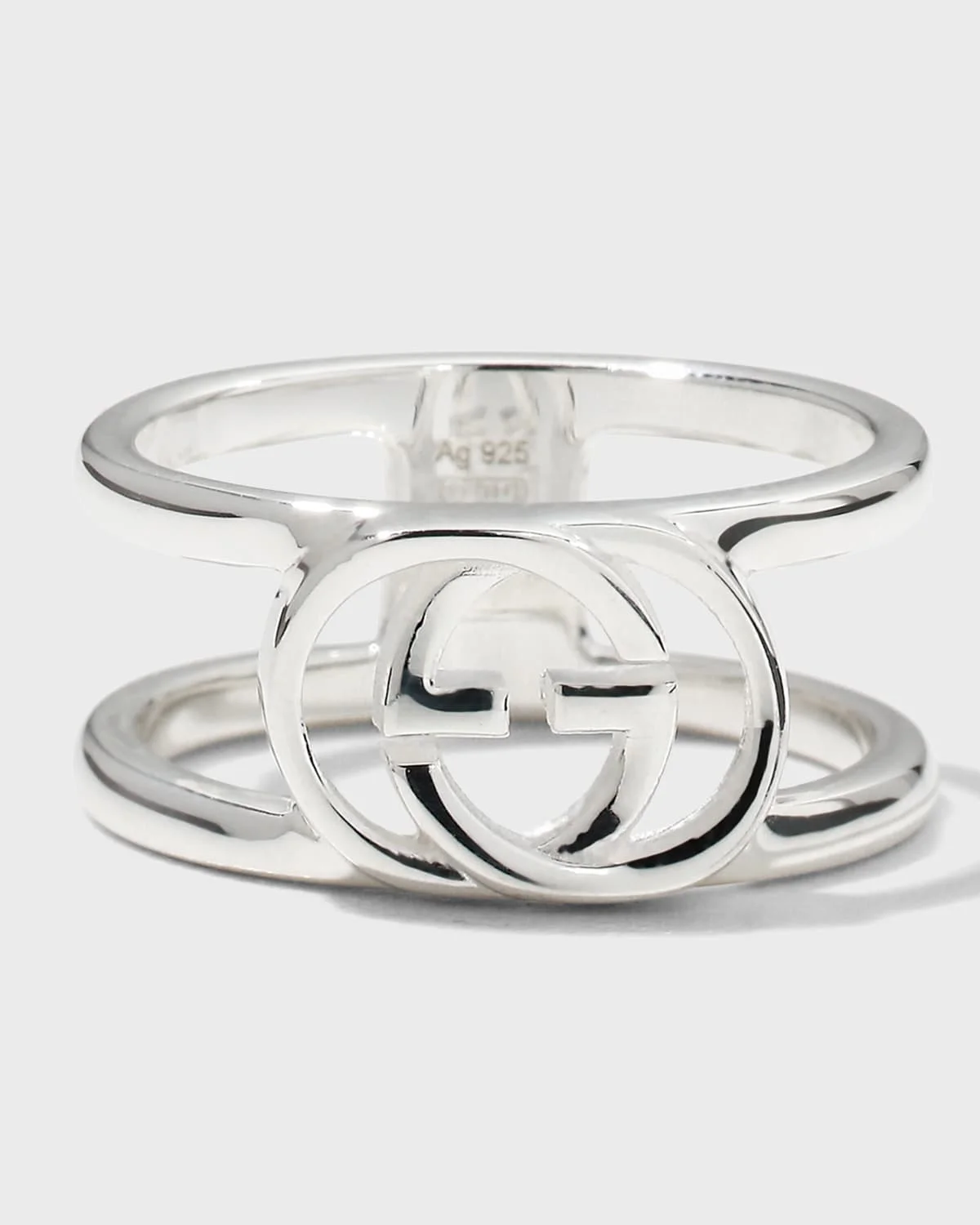 Gucci interlocking G ring. Measures 0.4" wide Sterling silver hardware. All gemstone carat weights (ct. t.w.) are approximate; variance may be 0.05 carat. To care for this piece please keep jewelry away from water and chemicals; remove during physical activities; clean and polish it with a soft cloth and store it separately.