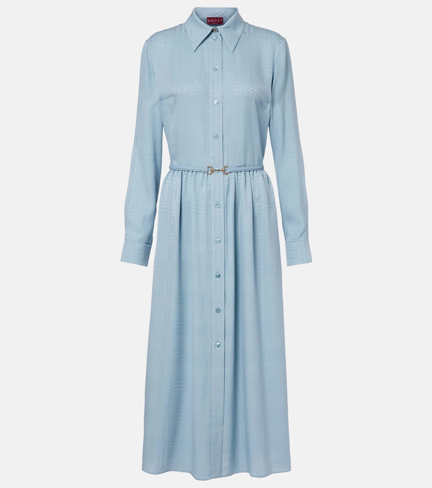 Gucci continues to redefine luxury and pursue its commitment to excellence and creativity. Italian-crafted from pure silk, this shirt dress features a classic silhouette with a cinching, detachable leather belt with iconic Horsebit hardware. Product Details - Material: 100% silk - Care instructions: dry clean - Made in Italy - Color: blue - Designer color name: Ancient Avio - Item color: blue - Pocket lining: 75% acetate, 25% silk - Pockets: side slit pockets - Details: 100% lamb leather - Insert: 100% cow leather - Contains non-textile parts of animal origin - Closure: buttoned front - Cuff: buttoned - Detachable belt - Item number: P01119082 Size & Fit - True to size - Dropped shoulders - Cinched waist - Non-stretchy fabric - The model seen in the picture is 178cm-5'10" and wearing a size IT 40