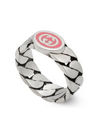 Interlocking G enamel-detail ring Gucci showcases signature house codes on the Interlocking G ring. Crafted from sterling silver, the piece features a modern gourmette band, detailed with a pink Interlocking G enamel detail that forms the focal point of the accessory. Highlights - Silver - Sterling silver - Chunky band - Signature interlocking g logo - Enamel detail Imported