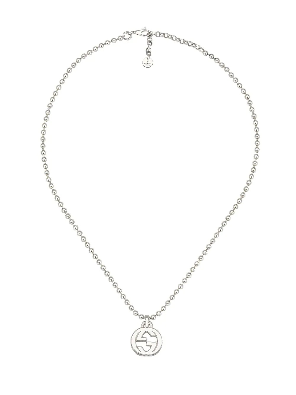 The interlocking G has remained one of the most iconic codes of the House since its introduction. The distinguishing symbol is made in sterling silver and hangs from a boule chain. Sterling silver. Interlocking G pendant. 40cm length adjustable to 45cm. Made in Italy. Gucci guarantees, internally and within its supply chain, respect for standards of Social & Environmental Responsibility in line with its sustainability strategy. Made in Italy Composition Sterling Silver 100% Product measurements for size: One Size Length when open: 44.45 cm (17.5 in) Length: 39.37 cm (15.5 in)