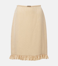 An iconic name within fashion on a global scale, Gucci was founded in Florence in 1921. This midi skirt is made from silk jacquard with a subtle Interlocking G pattern and a ruffled hemline. Product Details - Material: 100% silk - Care instructions: dry clean - Made in Italy - Color: beige - Designer color name: Gardenia - Item color: beige - Closure: concealed zipped back - Item number: P01119290 Size & Fit - True to size - Non-stretchy fabric - High-waisted - The model seen in the picture is 178cm-5'10" and wearing a size IT 40