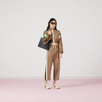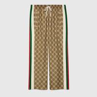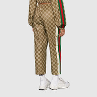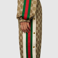 The Interlocking G is reworked into an allover motif printed on this tearaway jogging pant. Recalling the Web, a green and red stripe further enriches the style. Influences drawn from the sportswear and leisurewear worlds collide into an inherently Gucci style juxtaposing athletic inspired shapes with emblematic House's codes. - Olive green and ivory technical jersey with Interlocking G print - Green and red Web stripe down the leg - Elastic waistband with drawstring - Snap button closure down the leg - Length: 34.6", based on a size small - Made in Italy - The model is 5'6" tall. The product in this image is a size small