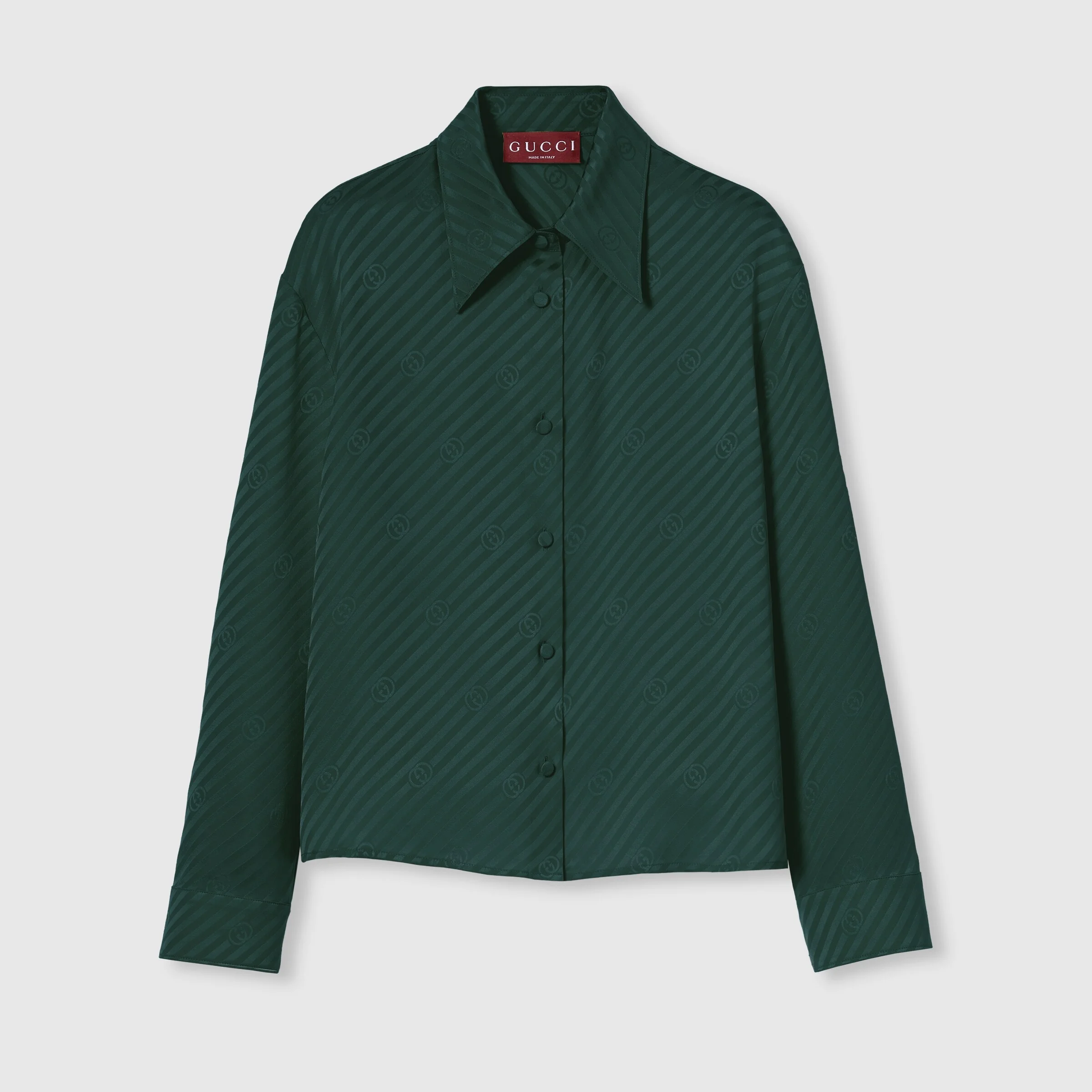 In the Fall Winter 2025 collection, this shirt is crafted from dark green diagonal Interlocking GG silk jacquard. Designed with a pointed collar and a covered button closure, the style is finished with buttoned cuffs. - Dark green diagonal Interlocking GG silk jacquard - Long point collar - Button closure - Length: 22"; based on a size 38 (IT) - Made in Italy