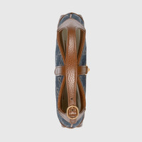 Brought back to the forefront, the recognizable shape is presented in denim with a GG motif and enhanced with an additional, detachable shoulder strap. Attached to the bag with a buckle closure, the second strap adds a contemporary feel to the archival style, providing new ways to wear—from top handle, shoulder to cross body. The Jackie 1961: available exclusively in Gucci stores and on Gucci.com - Dark blue and ivory eco washed organic GG jacquard denim - Brown leather trim - Gold-toned hardware - Cotton linen lining - Inserts contain leather made through an alternative metal or chrome free tanning process, reducing the environmental footprint compared to traditional methods. - Interior: 1 open pocket - This style is sold with an additional shoulder strap which can be attached to the bag with a buckle closure - Handle: 7" strap drop from central hole, handle with additional shoulder strap: 22" drop from central hole - Piston closure - This item can fit a cell phone up to 3.1”W x 6.6”H x .4”D - Mini size: 7.5"W x 5.1"H x 1.2"D - Weight: .45kg - Made in Italy - The model is 5'8" tall