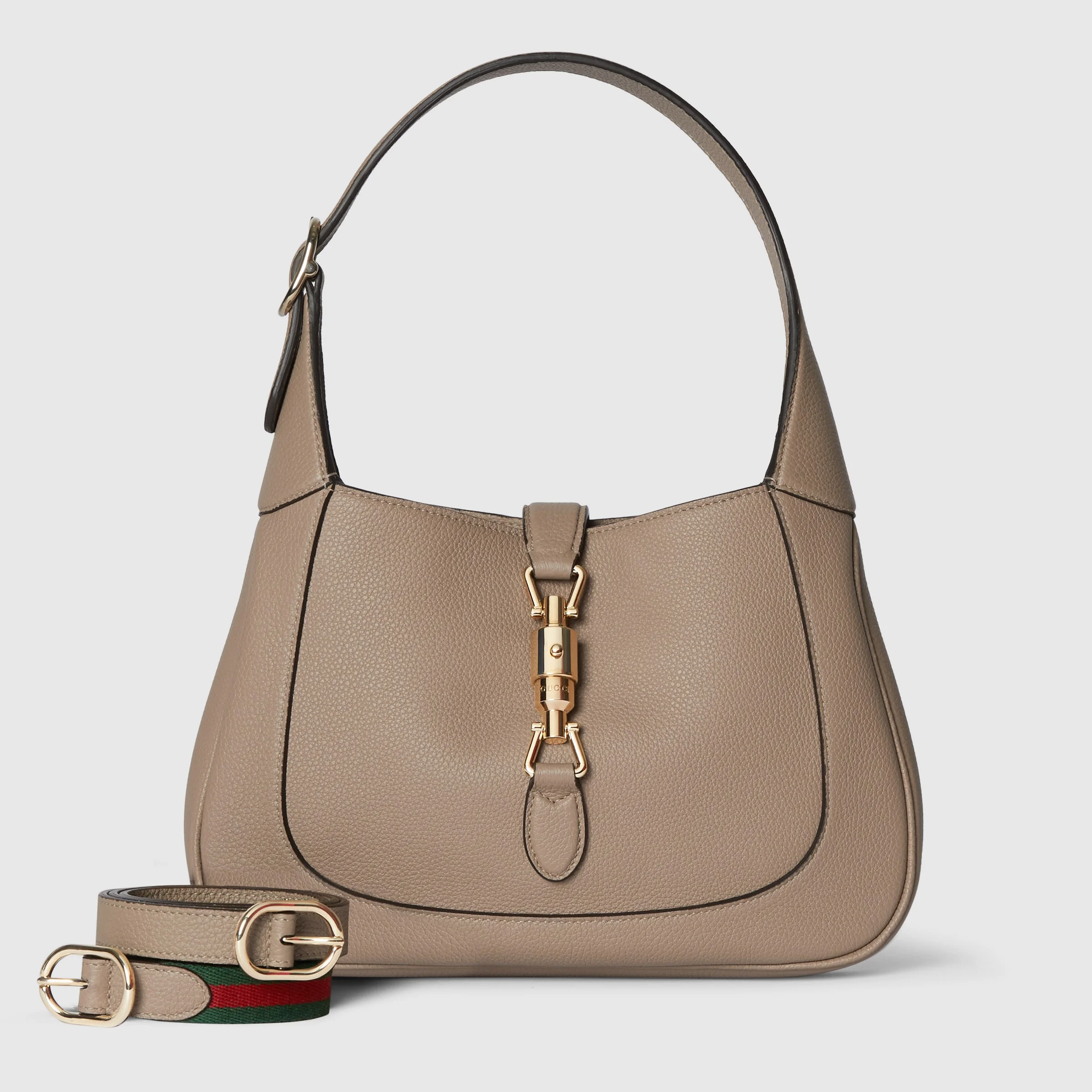 In the Fall Winter 2024 collection, the Gucci Jackie 1961 shoulder bag with new light gold-toned piston closure features fine taupe leather, highlighting the craftsmanship, crescent shape, and sleek silhouette of the House's iconic handbag. This small size comes with a leather strap and additional green and red Web strap for different styling possibilities. - Taupe natural grain leather - Light gold-toned hardware - Unlined - Interior: 1 zip pocket with Gucci Crest zip puller - Additional leather strap with 20.5" drop - 7.1" handle drop - Detachable Web shoulder strap with 20.5" drop - Piston closure - Weight: 0.9lbs, approximately - Small size: 10.8"W x 7.5"H x 1.6"D - Made in Italy - Fits up to: iPhone Pro Max/Plus, Airpods, long wallet, and lipstick