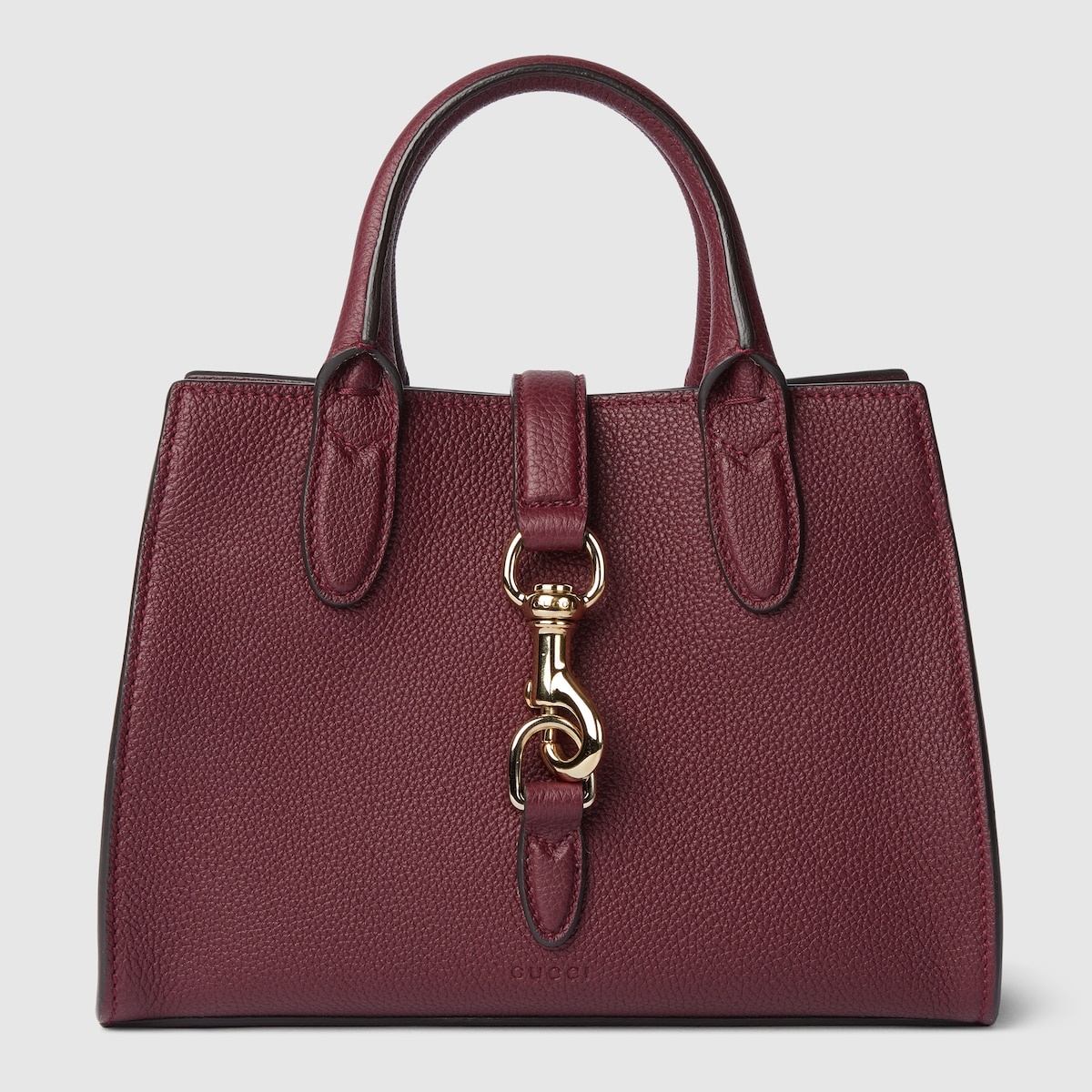 This small tote bag is the latest addition to the Jackie line, which radiates elegance and sophistication. Made from high-quality leather in Gucci Rosso Ancora red, it features a distinctive natural grain. The bag can hold all your daily essentials, and is ideal for any occasion with its detachable and adjustable shoulder strap, top handle design, and signature hook closure. - Gucci Rosso Ancora leather - Light gold-toned hardware - Unlined - Interior: 2 open pockets - 2.7" handle drop - Detachable and adjustable shoulder strap with 19.6" - 12.2" drop - Strap length: 44" - Hook closure - Small: 9.4"W x 6.8"H x 3.3"D - Weight: 1.3lbs, approximately - Made in Italy - Fits up to: iPhone Plus, Airpods, wallet, and lipstick