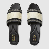 The latest Gucci collection explores archival symbols in new ways. These versatile sandals are crafted in cotton cavas and are defined by a 'Gucci' embroidery. - Black and white cotton canvas - Women's - Leather lining - 'Gucci' embroidery - Leather sole - Flat - Made in Italy