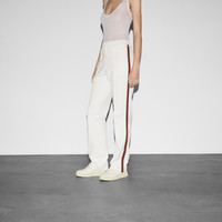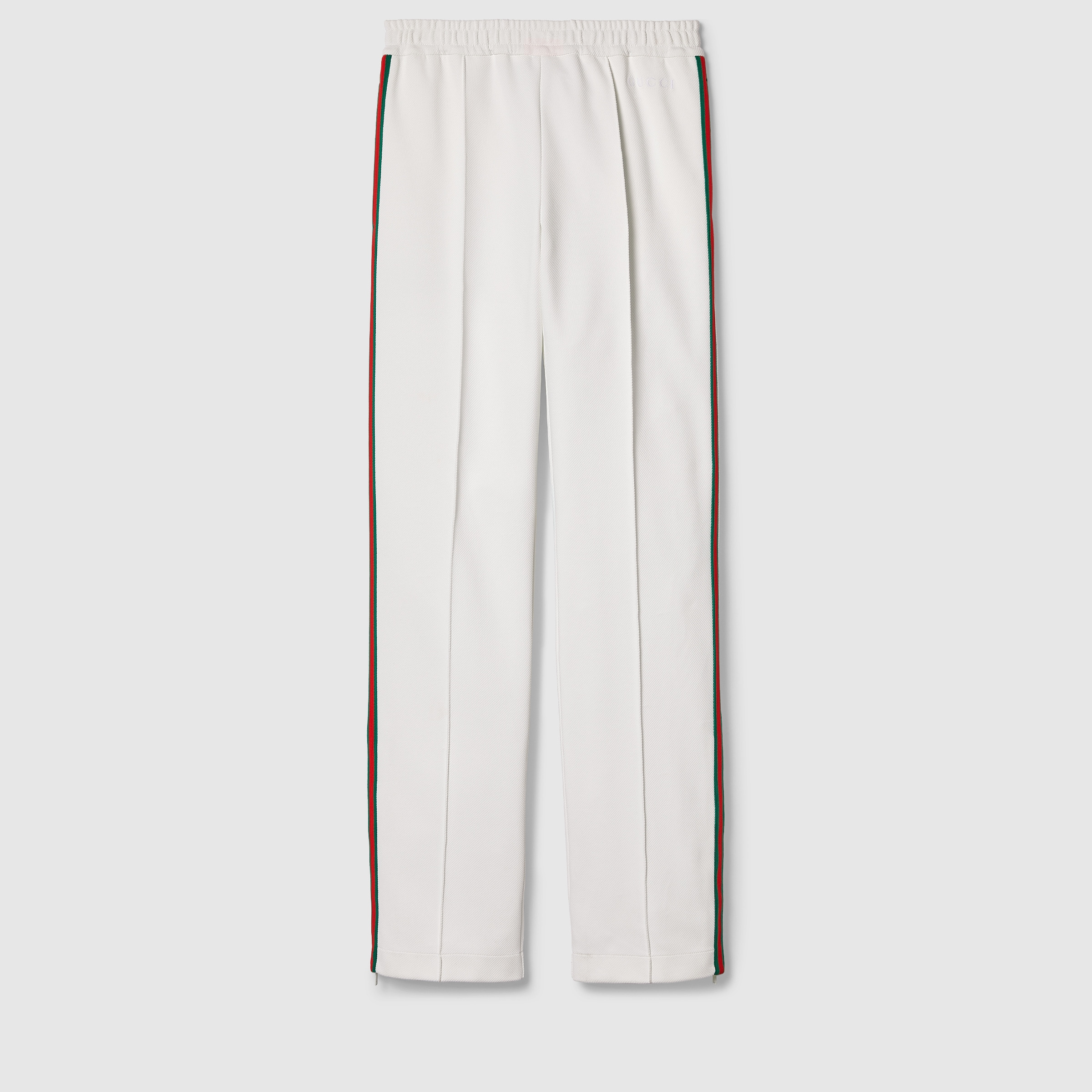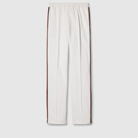 Tops and bottoms from jersey to denim and other materials open up numerous styling possibilities. This pair of jersey drill jogging pants with an elastic waistband sport a casual silhouette. A Gucci embroidery and Web stripe elevate the style with logo details. - Off white jersey drill - Gucci embroidery - Web stripe down the legs - Elastic waistband with drawstring - Two back pockets - Length: 42.5" based on a size XS - Made in Italy - The product shown in this image is a size extra small