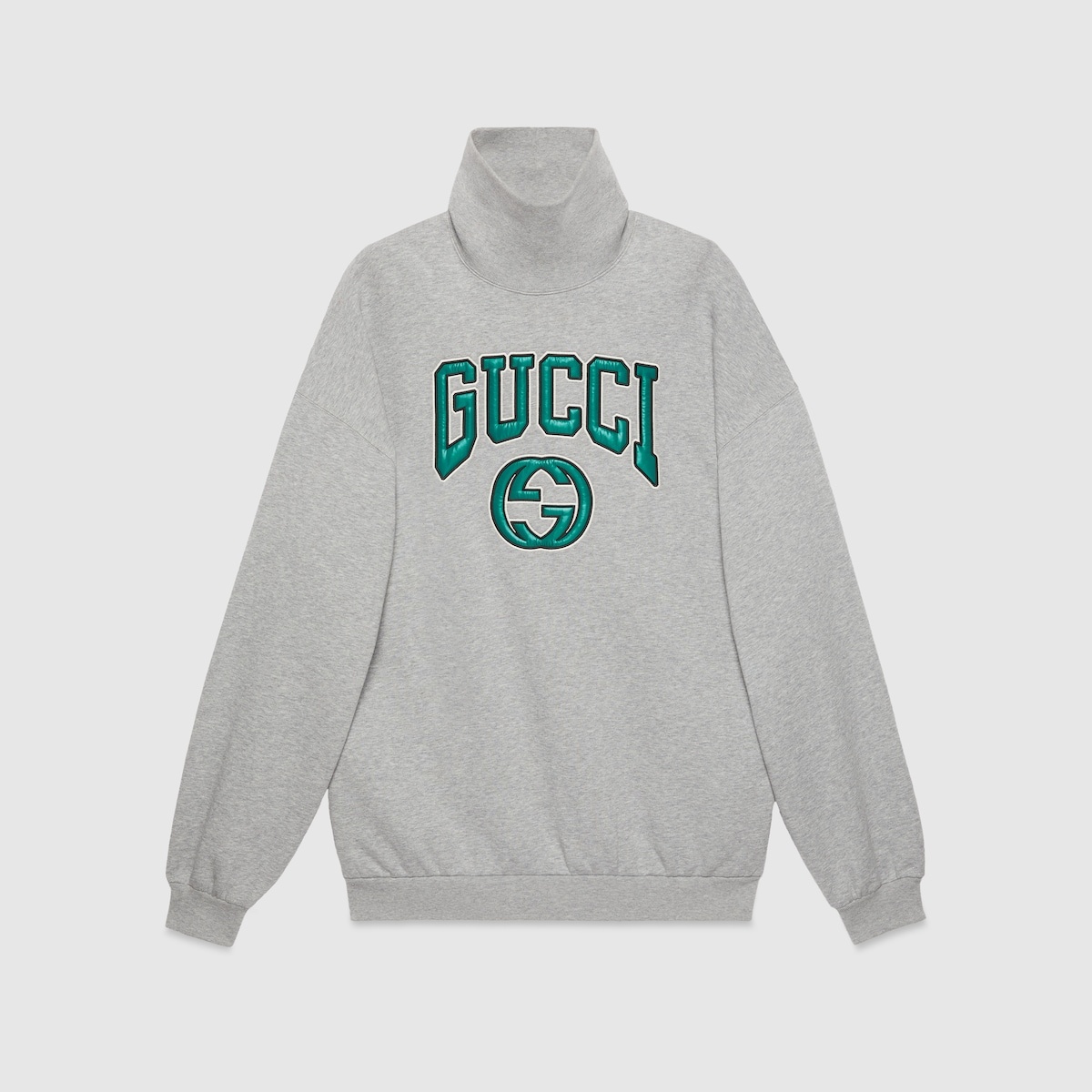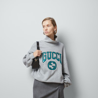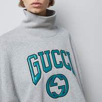 A relaxed attitude speaks volume as casual pieces become indispensable. Sweatshirts, hoodies, and t-shirts with drop shoulders, cropped lengths, and generous fits are adorned with signature embellishments. Crafted from a grey cotton jersey, this turtleneck cotton jersey sweatshirt is defined by a striking Gucci embroidery. - Grey cotton jersey - Rib trim - Gucci Interlocking G varsity embroidery - Turtleneck - Dropped shoulder - Made in Italy - The product shown in this image is a size small