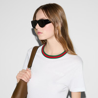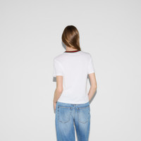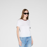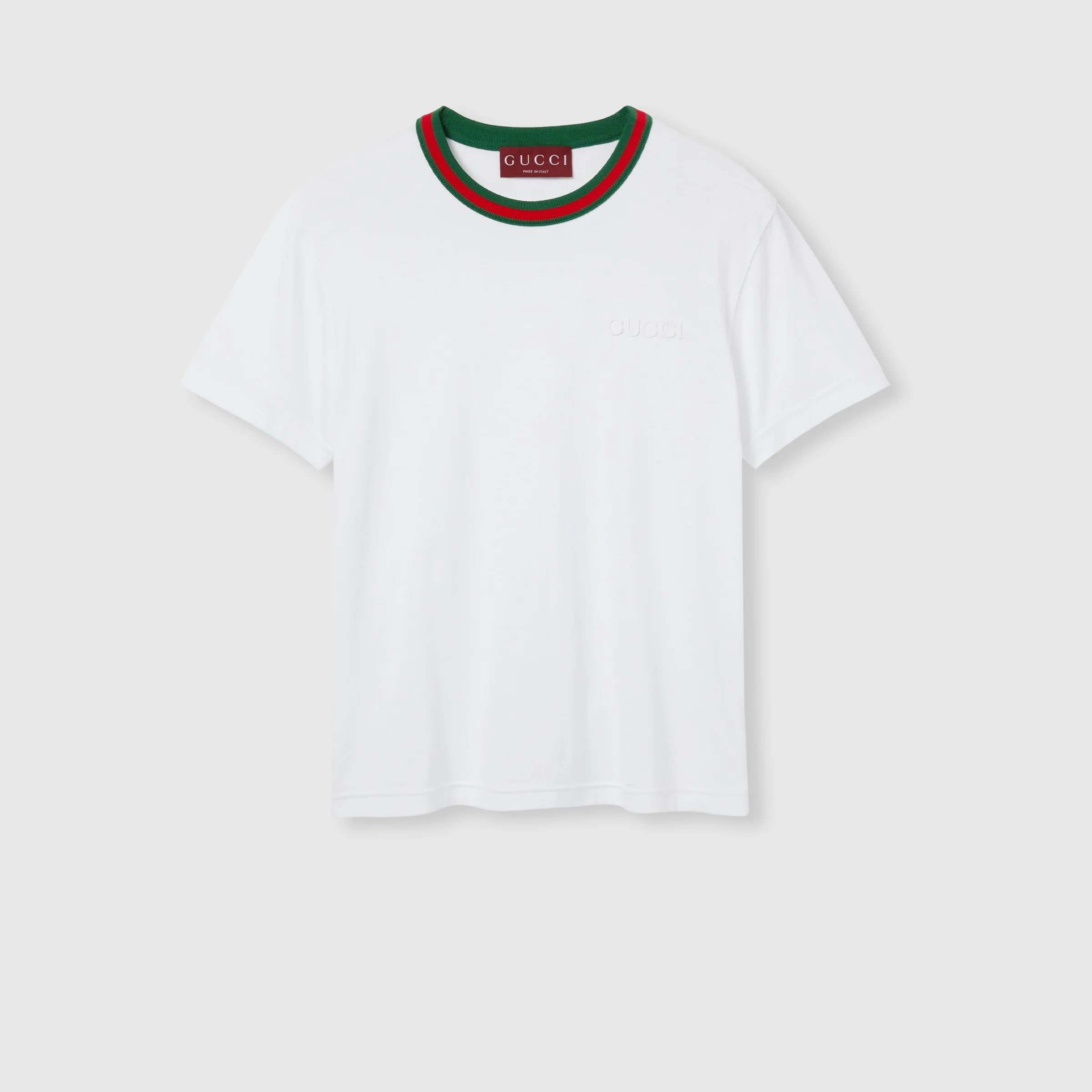 Gucci's House codes continue to evolve for the new season across relaxed T-shirts and jersey pieces. This short sleeved T-shirt has been crafted from a light cotton jersey and is enriched with a Gucci logo patch and a green and red Web trim. - White light cotton jersey - Green and red Web trim - Embroidered Gucci logo patch - Crewneck - Short sleeves - Length: 21.5"; Shoulder: 15.2"; Chest: 16.7"; Sleeves length: 6.7" based on a size s - Made in Italy - The product shown in this image is a size small