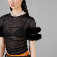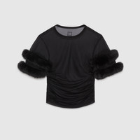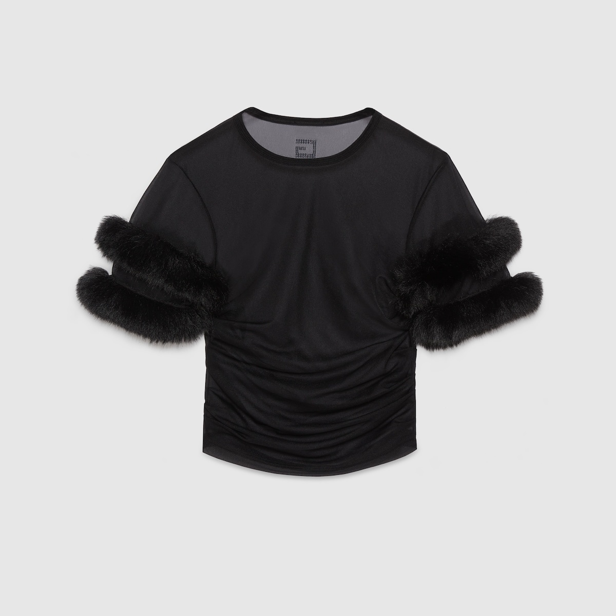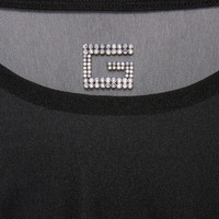 The contrast between plain black and bold textures innovates the classic rock look. Beyond ready-to-wear pieces, accessories such as handbags and eyewear let unique individual styling shine through. This black jersey top reveals soft fabric bands across the sleeves and is further enriched by a Retro Square G with crystals appliqué. - Black jersey - Soft fabric detail - Retro Square G with crystals appliqué - Crewneck - Short sleeves - Rib trim - Length: 16.7" based on a size extra small - Made in Italy - The product shown in this image is a size extra small