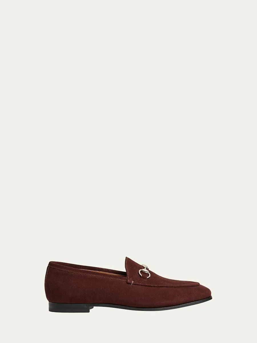 Gucci "Jordaan" calf suede loafers 0.17 in / 5 mm flat heel Round apron toe Goldtoned horsebit hardware Notched vamp Slipon style Leather outsole Lining: Leather Made in Italy