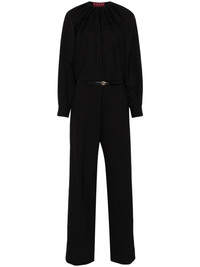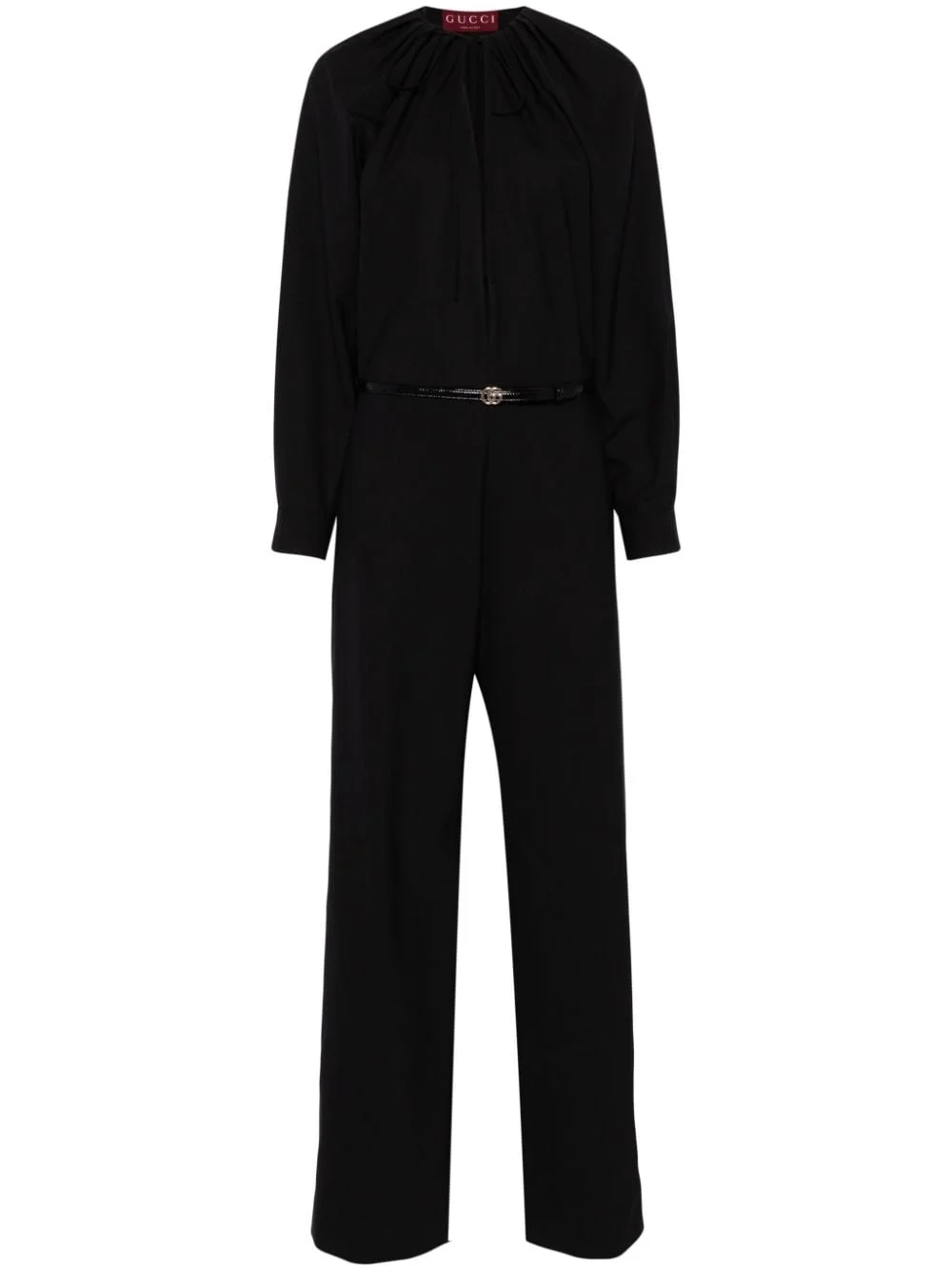 keyhole-neck jumpsuit Highlights - Black - Wool blend - Interwoven design - Plunging keyhole neck - Gathered tie neck - Long raglan sleeves - Buttoned cuffs - Concealed side zip fastening - Detachable and adjustable waist belt - Signature double g buckle - Slip pockets to the sides - Straight leg Made in Italy Composition Outer: Bos Taurus 100%, Wool 96%, Elastane 4% Lining: Silk 100% SIZE & FIT Model measurements Height 5 ft 10 in(1.78 m) Bust/Chest 33.46 in(85 cm) Hips 36.22 in(92 cm) Waist 23.22 in(59 cm) Measurement SLEEVE LENGTH 29.13 in(74 cm) INSIDE LEG 35.03 in(89 cm) HIPS 38.58 in(98 cm) WAIST 29.13 in(74 cm) FittingInformation Designed to be unstructured, offering a loose fit throughout The belt offers adjustability for fitted preferences Made from a midweight stretch fabric, this piece offers elasticity and flexibility when worn