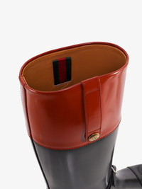 For Gucci Aria, the equestrian inspiration mixes with leather elements in order to explore the sensual mood that weaves through the collection. Here, this pair of knee-high leather boots is characterized by unexpected elements such as the Horsebit harness detail and the perforated Interlocking G. - Black leather - This item uses women's sizing - Brown leather trim - Horsebit harness detail at the back - Perforated Interlocking G detail - Side zip closure - Flat - .8" heel height, 15.3" shaft; 14.2" circumference - all measurements based on a size 37 (IT) - Made in Italy